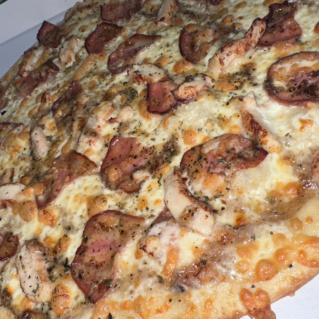 Tomate mozarella tiras de pollo asado bacon pepperoni salsa picante y orégano