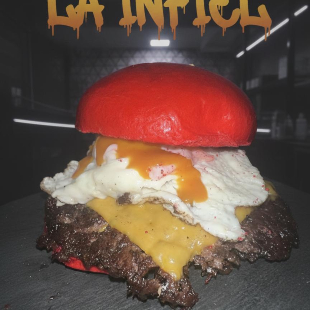 Pan brioche , doble smash burguer, queso cheddar, queso de cabra,huevo,cebolla crujiente y salsa mostaza y miel
