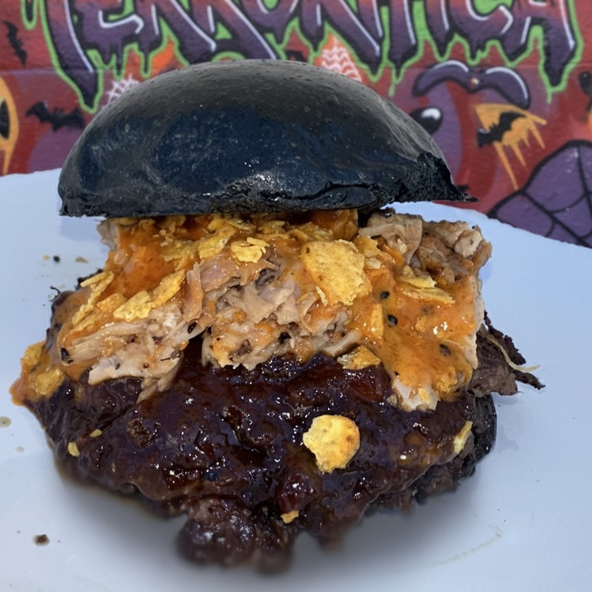 Pan brioche negro Doble smash de vacuno Queso cheddar Mermelada de cecina Pulledpork Salsa emmy Doritos bits