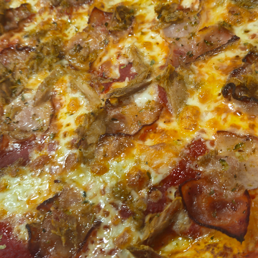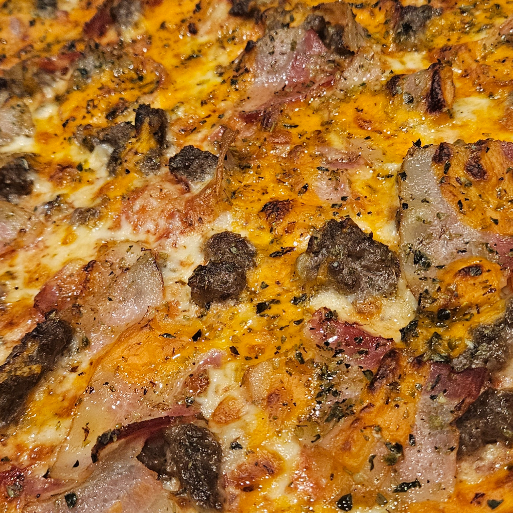 salsa de tomate, mozzarella, pollo, Bacon, jamón York y salsa Cheddar ahumada