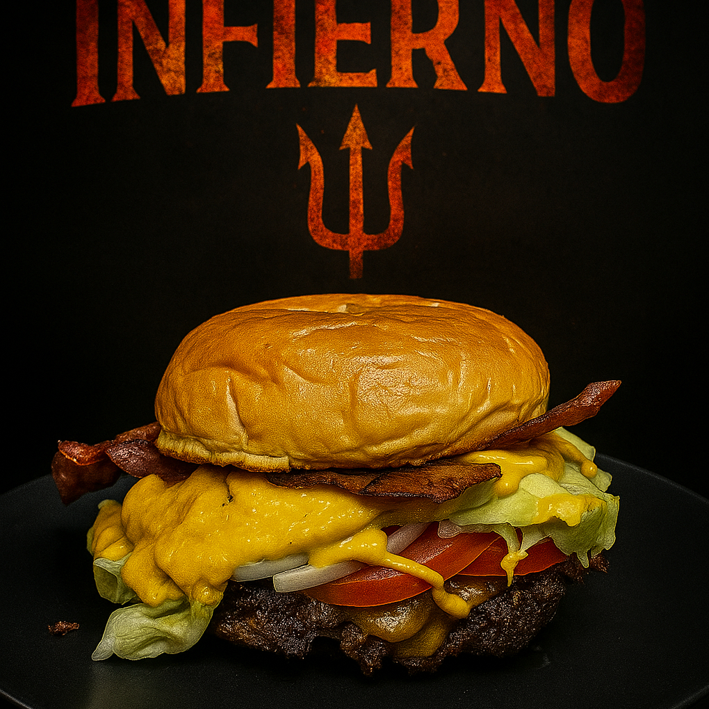 Pan brioche roj,doble Smash 100% de vacuno,doble queso edam,cebolla caramelizada,bacon crujiente,Pulled pork y salsa bourbon